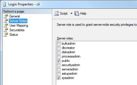 To resolve the second issue, create a new user – cli in my case, and set the ‘Server Roles’ as shown below. You may have to uncheck ‘Enforce password policy’ when creating the new user (depending on the password).