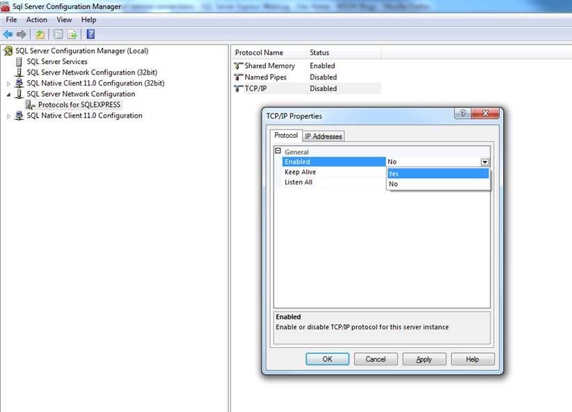 Enable TCP/IP to resolve the first error and restart the SQL Service: