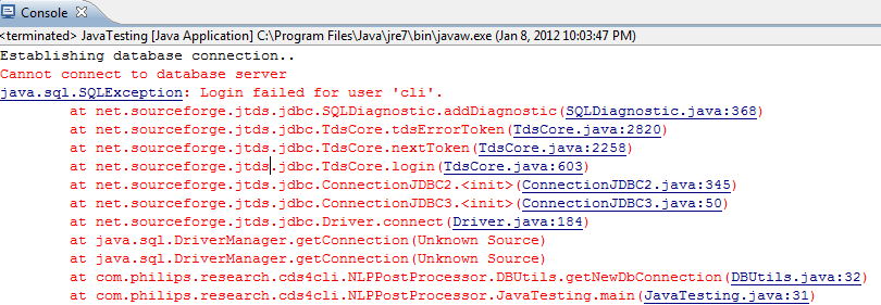 String url = "jdbc:jtds:sqlserver://MYPC/MyDB;instance=SQLEXPRESS"; try { Class.forName("net.sourceforge.jtds.jdbc.Driver"); conn = DriverManager.getConnection (url, userName,password); System.out.println ("Connection successful"); } catch (Exception e) { System.err.println ("Cannot connect to database server"); e.printStackTrace(); }