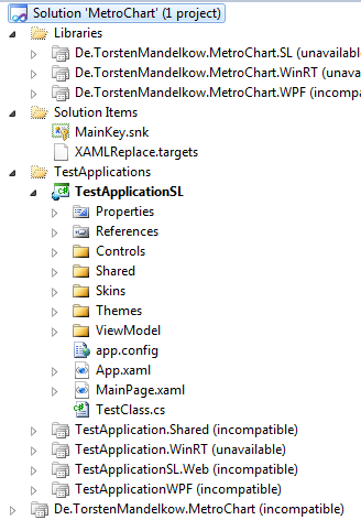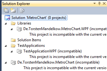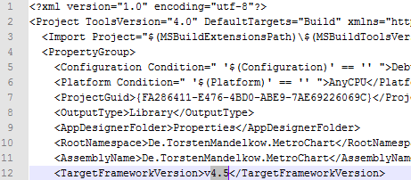 – Now, open Windows explorer and open the .csproj file in a text editor (like NotePad++) and change the ‘TargetFrameworkVersion’ from 4.5 to 4.0. You need to do this for the 3 files under De.TorstenMandelkow.MetroChart, De.TorstenMandelkow.MetroChart.WPF and TestApplicationWPF folders.
