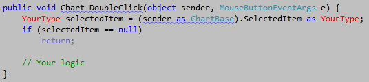 One of the things I wanted to do was find the underlying data when a user double clicks on a chart. To do this, you can add something like this in your xaml: