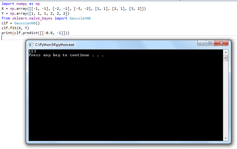 import numpy as np X = np.array([[-1, -1], [-2, -1], [-3, -2], [1, 1], [2, 1], [3, 2]]) Y = np.array([1, 1, 1, 2, 2, 2]) from sklearn.naive_bayes import GaussianNB clf = GaussianNB() clf.fit(X, Y) print(clf.predict([[-0.8, -1]]))