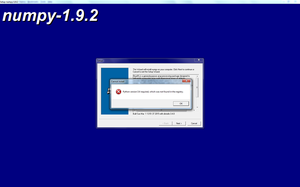 If you google ‘visual studio no module named numpy’ or ‘no module named numpy’ you’ll find tons of threads with various suggestions, including installing/upgrading pip (pip comes with 3.4), using easy_install and running other registry updates. I couldn’t get any of these to work. With pip, it gave me false hope looking as if everything was fine: