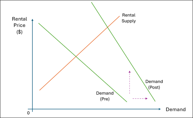 I think the following figure illustrates the shift in supply and demand dynamics before and after the fires. In this case, the demand curve not only shifts to the right but also becomes steeper, reflecting decreased sensitivity to price. This steepening effect may be more pronounced in the affluent neighborhoods where displaced residents more likely have greater purchasing power to compete for housing. Conversely, in less affluent areas, the slope might not increase as drastically since these lower-income households often have limited savings (required to cover upfront costs like security deposits), and may also be experiencing a loss of wage-based income.
