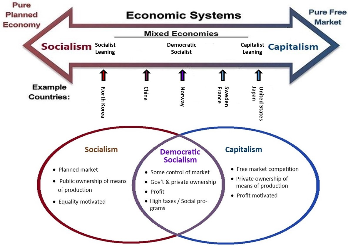 The two major economic systems in modern societies are capitalism and socialism. In practice, no one society is purely capitalist or socialist, and falls somewhere in the spectrum between the two as shown below. For example, the United States is a capitalist nation, but the government still regulates many industries to varying degrees (Ramirez, Latham, Hernandez, & Juskewycz, 2022).
