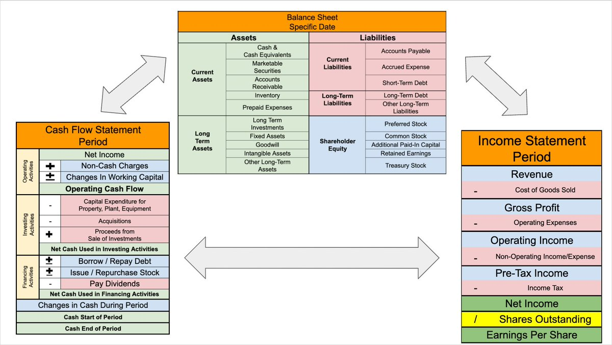 Each of these statements gives stakeholders insight into the health and viability of a business. Investors use them to assess the potential return on investment, while creditors might use them to evaluate the risk of lending money. Understanding how these financial statements interact and provide different perspectives is key to making informed business decisions. Following figure provides a nice view of the layouts and how the three major financial statements are interrelated (Feroldi, 2022):