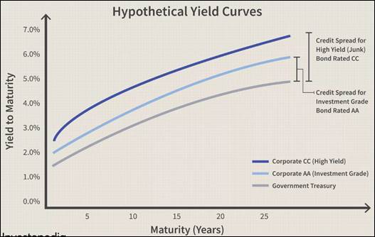 Treasury bonds are backed by the US Treasury and have the lowest risk. For higher risk bonds offered by companies, the rate is usually higher, and the curves would look something like (Harper, 2022):